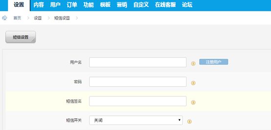 - 依次点击,系统管理后台->网站设置->短信设置,填写用户名(APP_ID)和密码(APP_KEY)。
