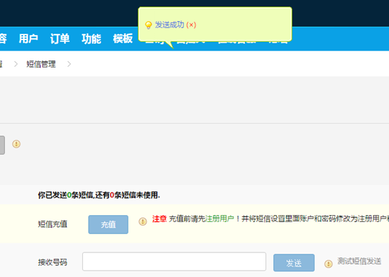 点击短信管理,填写手机号码测试,提示发送成功说明短信插件安装成功