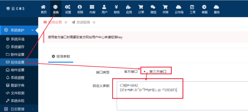 - 站后台->系统->短信设置”选择第三方接口,自定义参数中填写APP_ID与APP_KEY,一行一个。