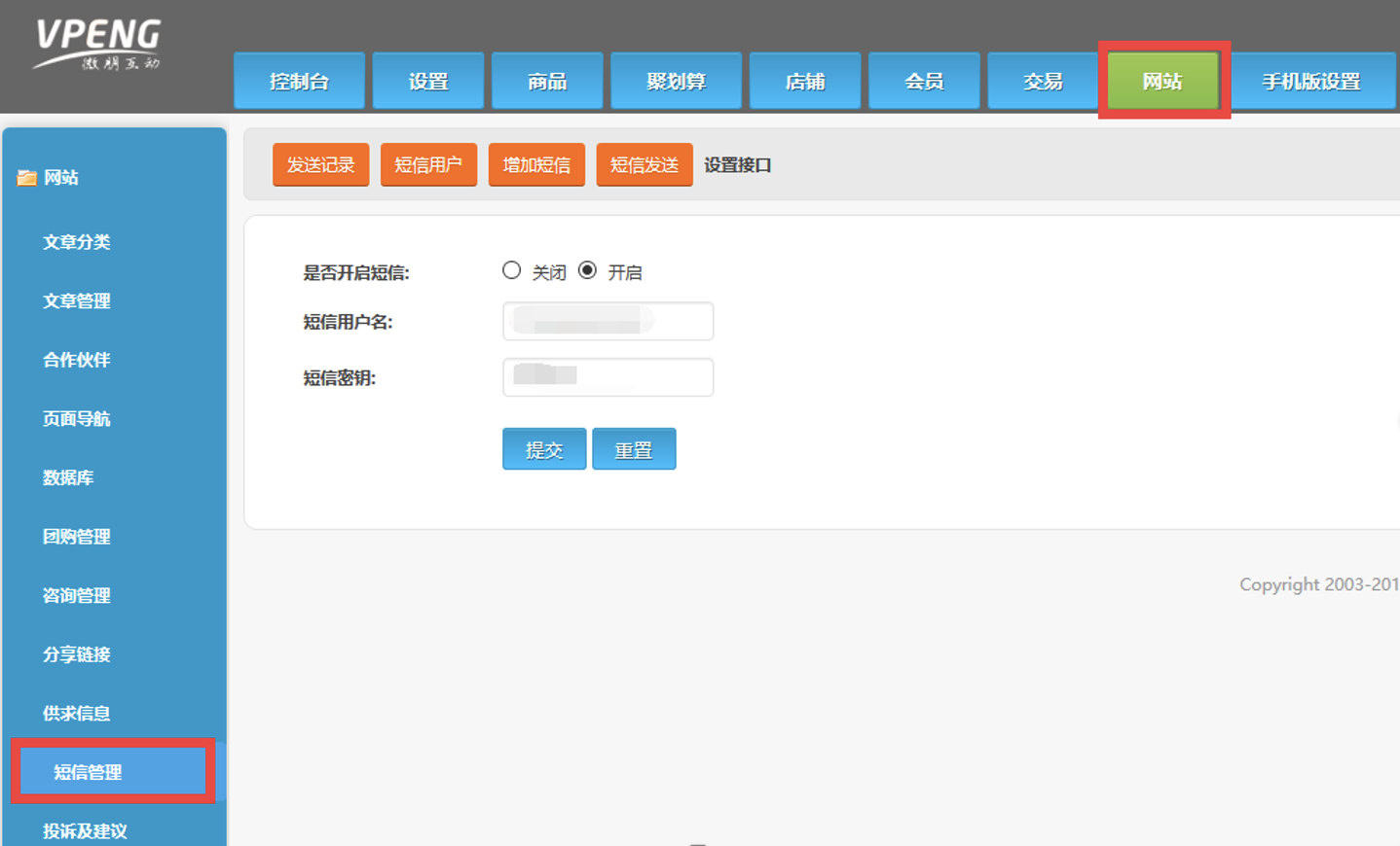 - 打开ECMALL_V2.3系统管理后台->网站->短信管理,填写短信配置信息并提交;