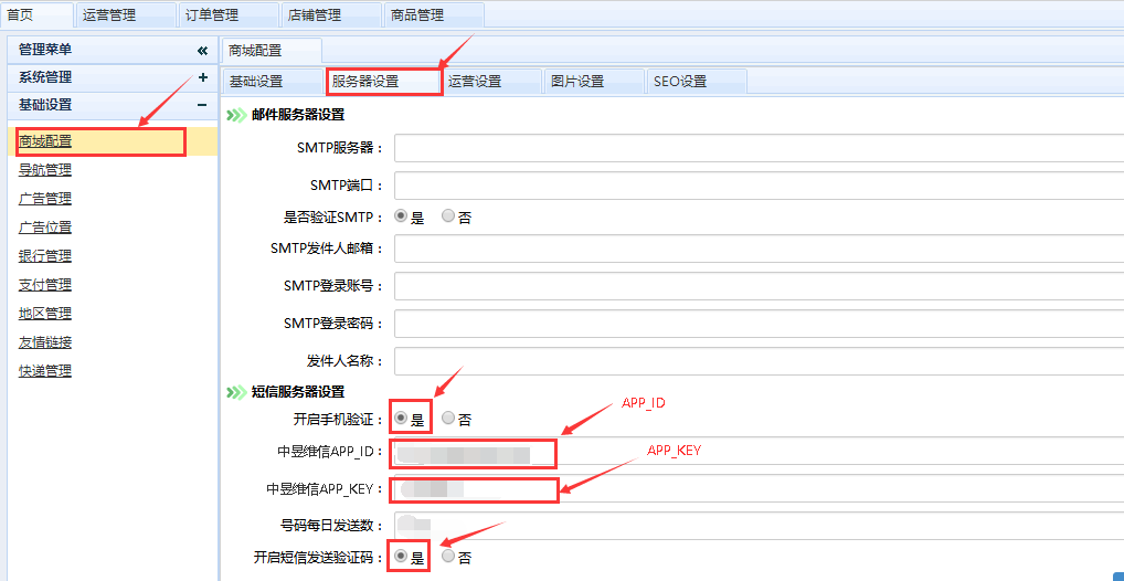 - 系统后台-》基础设置-》商城配置-》服务器设置,填写短信参数APP_ID和APP_KEY,开启短信功能。