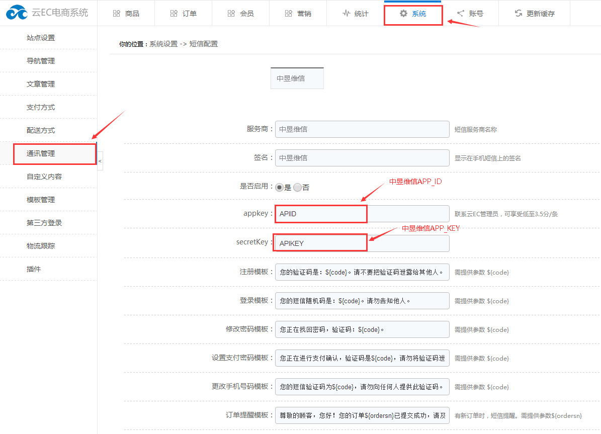 - 系统-》通讯管理-》手机短信配置。填写APP_ID和APP_KEY。